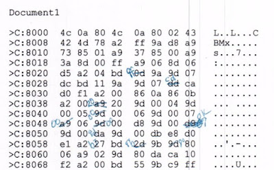 Having access to the bytes that SHOULD be shown in the ML Monitor but were not, I printed out those correct bytes on a piece of paper, and compared them to the bytes shown in the ML monitor. Whenever a byte did not match, I crossed it out in blue and wrote in the Corrupted byte shown in the ML monitor.